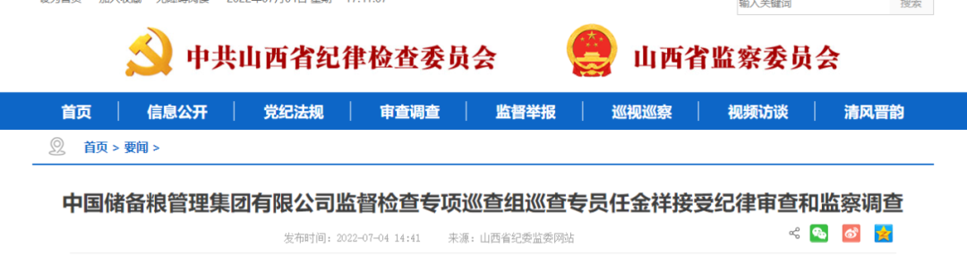 中国储备粮管理集团有限公司监督检查专项巡查组巡查专员任金祥涉嫌严重违纪违法,目前正在接受中国储备粮管理集团有限公司纪检监察组纪律审查和山西省监察委员会监察调查。