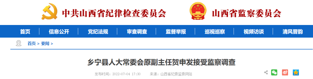 乡宁县人大常委会原副主任贺申发涉嫌严重违法,目前正接受临汾市监委监察调查。
