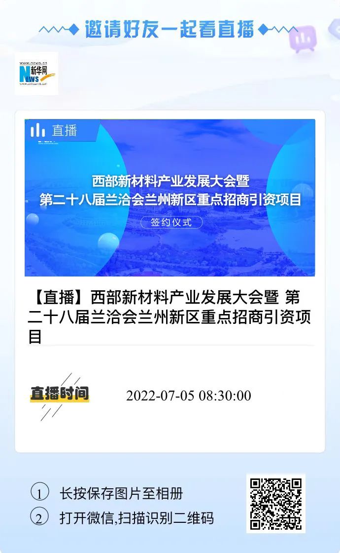 西部新材料产业发展大会暨第二十八届兰洽会兰州新区重点招商引资项目签约仪式明日(7月5日)举行,上午8:30-12:00,新华网将进行图文直播。敬请关注!