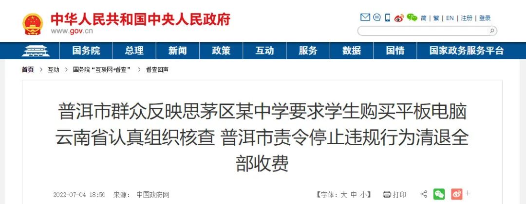 中国政府网7月4日消息,普洱市张先生通过国务院“互联网+督查”平台反映,思茅区第四中学以是否购买平板电脑划分智慧班和传统班,智慧班的学生需要花5800元购买平板电脑。