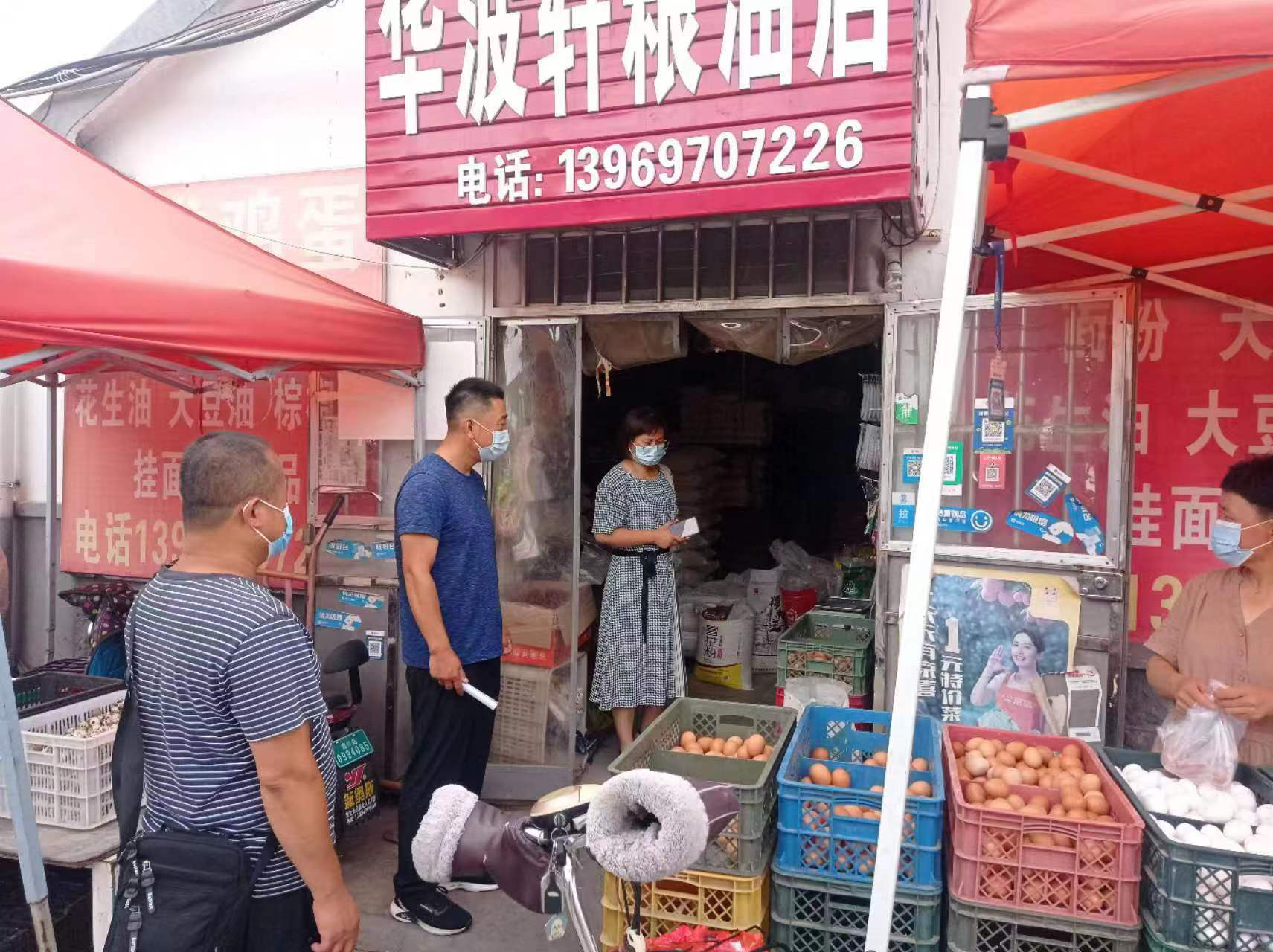 检查人员对正在营业的粮油店、快递物流等进行疫情防控相关措施检查,检查商户是否张贴场所码、工作时是否佩戴口罩,店内是否配备消毒液、体温枪,并要求来店顾客戴口罩、查看健康码、测体温,督促商户做好卫生清洁工作。每到一处,工作人员都认真检查并详细查看场所消毒记录情况,对落实疫情防控措施不到位的商户进行提醒,并按规定要求其立即整改。