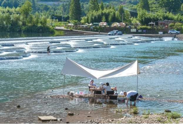 7月3日,常安镇横槎村沸腾坝附近,游客在壶源溪里扎好帐篷,摆好野餐,在青山绿水中尽享休闲时光。随着气温飙升,去壶源溪边露营成为很多游客避暑休闲的选择。
