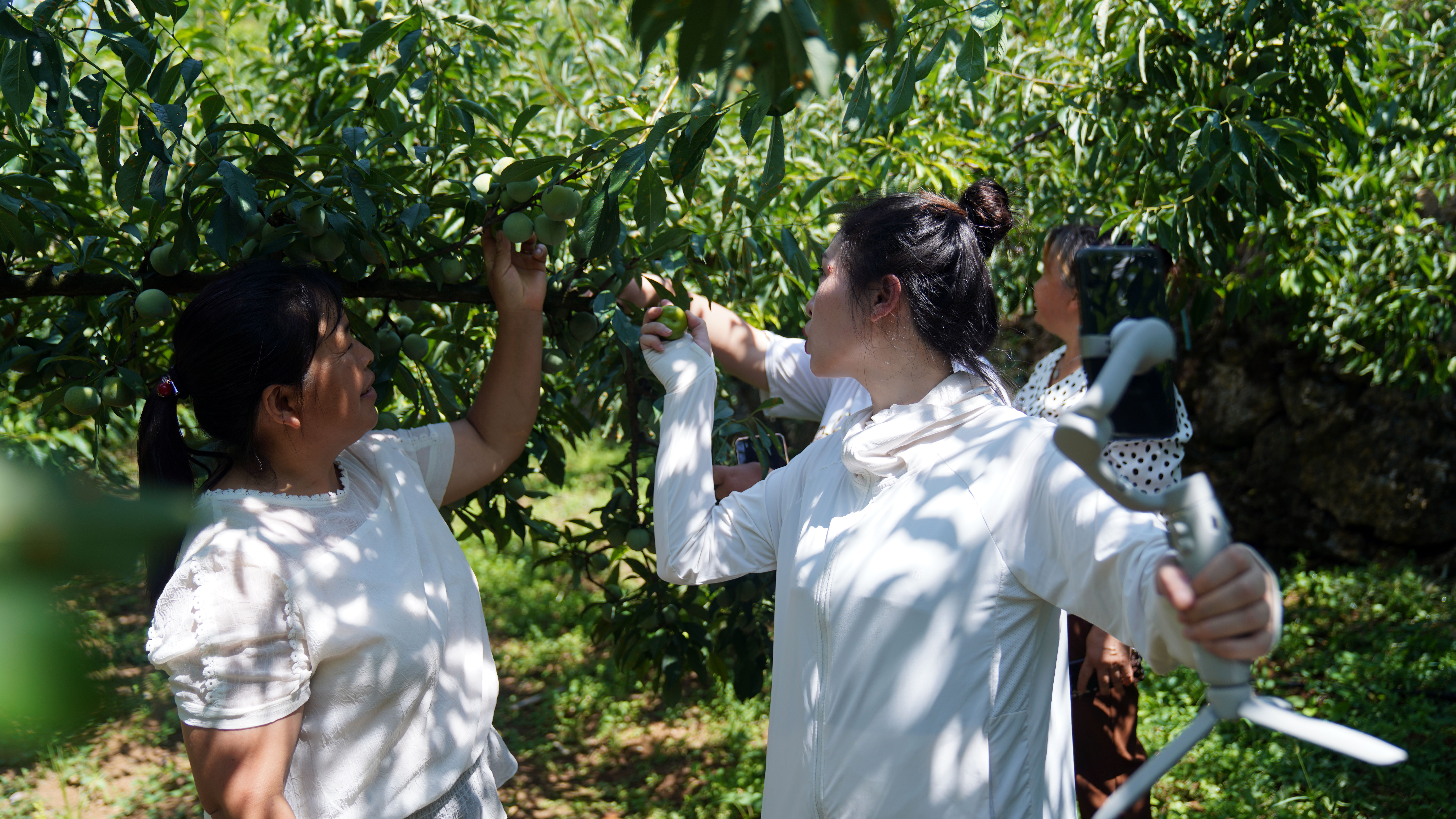 “妈妈,快过来,那边还有好几个大李子呢,我们多摘点带回家吧!”县城的冉芯瑜的爸爸是驻村工作队员,被推选为首批“晚李小天使”。