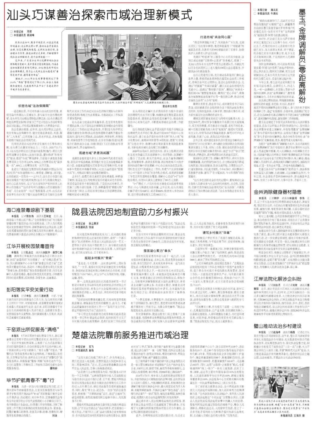 走进位于澄海区宝奥国际玩具城的中国汕头(玩具)知识产权快速维权中心,审理室、调解室、培训室、公共检索区一应俱全……去年1月,汕头出台全国行政裁决领域首个地方政府规章《汕头市行政裁决规定》,该中心以此为契机,设立“汕头市知识产权纠纷多元化解示范创建点”“汕头市专利行政裁决示范创建联络工作站”,为企业提供“一站式”维权服务。此外,汕头还在全国率先出台《关于强化法治保障促进市域社会治理现代化试点工作的决定》《汕头经济特区预防与化解纠纷促进条例》等地方性法规规章,为推动试点工作纵深开展保驾护航。