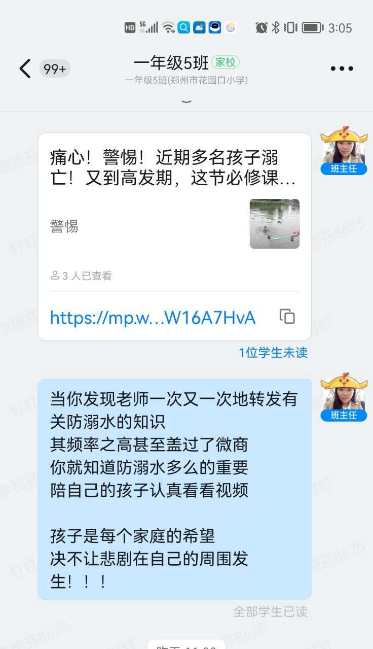 学生放假,可是安全不放假,我校的各位班主任们尽心尽责,老师通过多种形式进行防溺水安全教育,电话、家访、钉钉群中发送防溺水安全知识,提高家长的安全意识,增强家长监护意识,使家长切实负起监护人的责任。