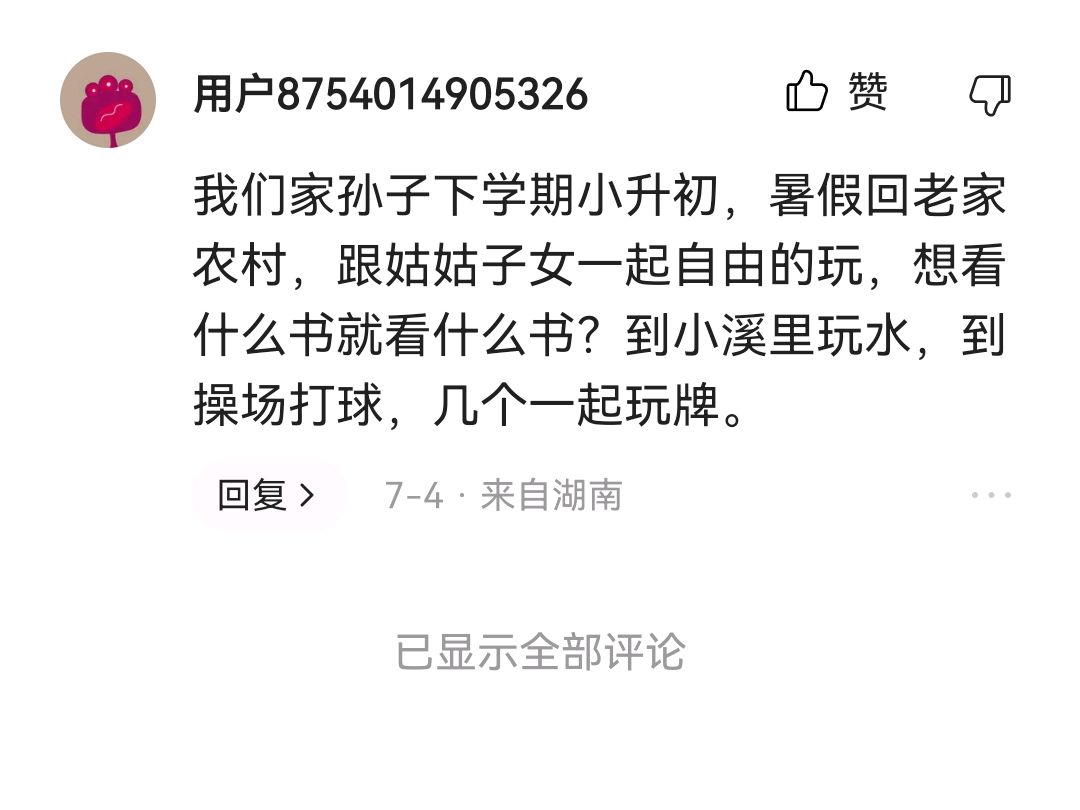 我昨天发了一个帖子说我女儿小升初了,这个暑假我准备带她预习初一课程。帖子底下有位网友评论说:“我们家孙子下学期小升初,暑假回老家农村,跟姑姑子女一起自由地玩,想看什么书就看什么书。到小溪里玩水,到操场打球,几个一起玩牌。”