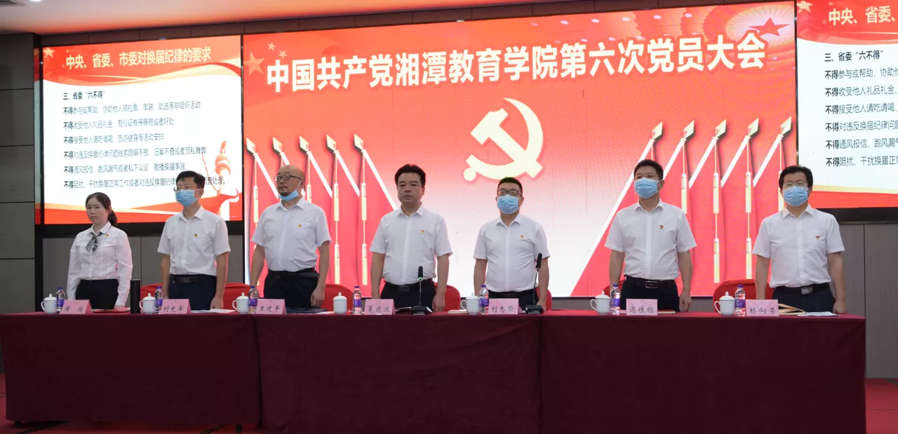 7月4日,湘潭教育学院第六次党员大会隆重召开。65名在职党员和离退休党员参会。湘潭市教育局党委委员、副局长彭奋强,秘书科科长黄大勇,市纪委监委驻市教育局纪监组一级主任科员周晓峰出席。会议还邀请了学院民进、民盟代表参加。