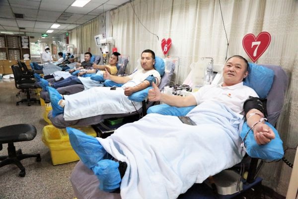 “献血大王”李光明(右一)携亲友团一起献血。通讯员聂东航 摄