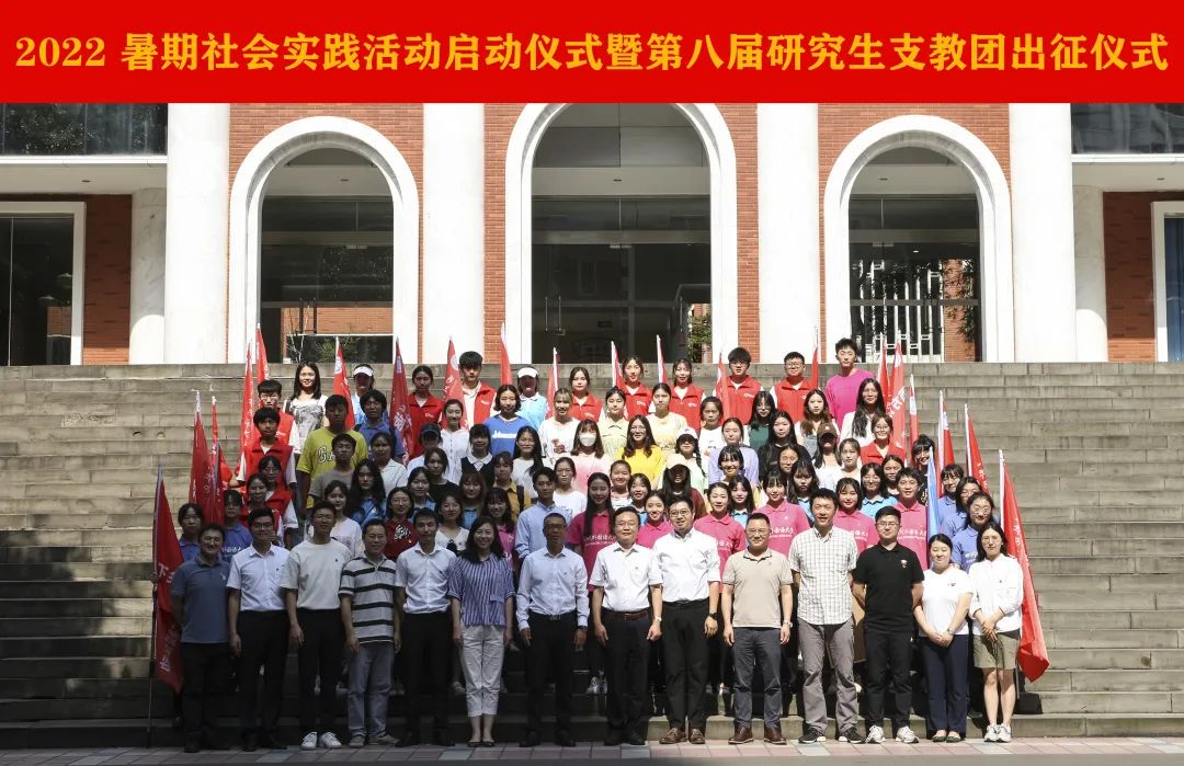 仪式最后,卢波分享了自己参与社会实践的经历,并对参加暑期社会实践活动的师生和第八届研究生支教团全体成员提出了三点希望。一是志存高远,脚踏实地。大家要对党忠诚,始终听党话、跟党走,保持正确的政治方向。要以“登山到顶”“入海到底”的精神,将目标锁在最高处,通过不懈的努力、脚踏实地的积累达到理想之境。二是找准大方向,找好小切口。大家既要解放思想,开阔视野,准确把握方向、大势、大局,也要把实践锻炼的成果融入当前学习、工作、学校建设中,用心、上心、尽心去思考学习工作中的热点、难点问题。三是注重把握细节。大家在实践过程中要明白“智从知来”“得从德来”“政从正来”,用暑期骄阳下的一份耕耘收获未来成长道路上的一片绿荫。