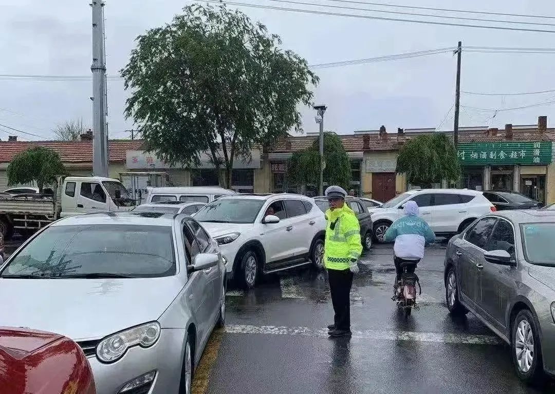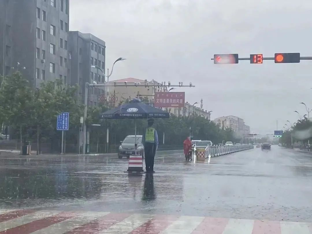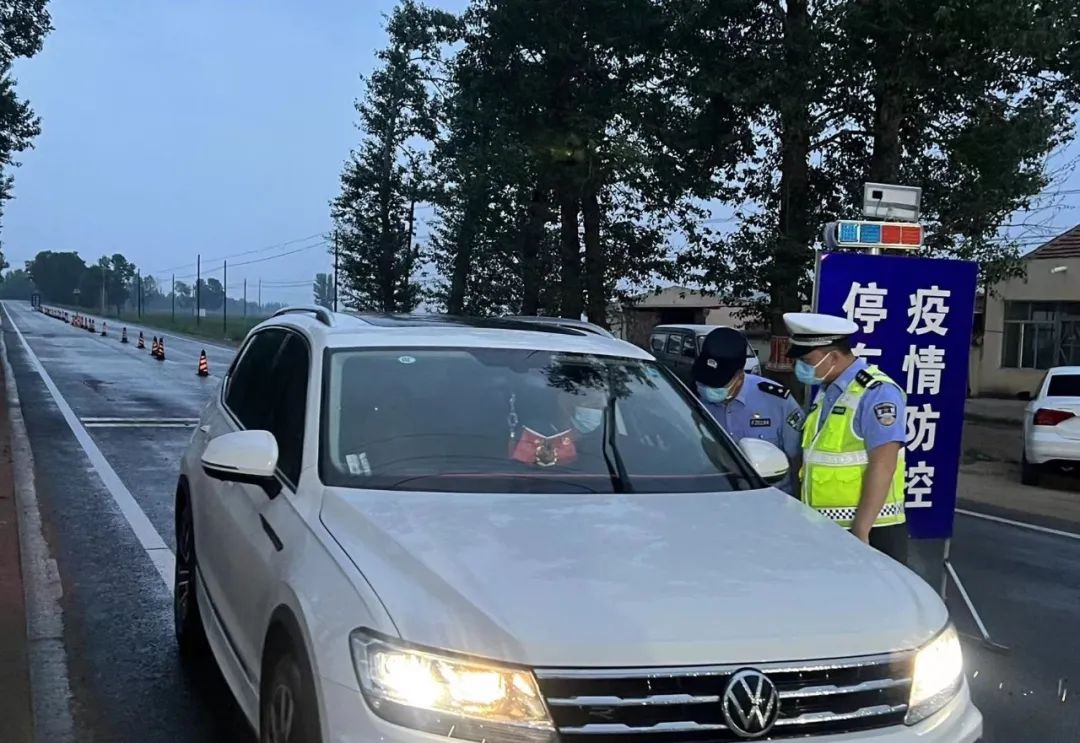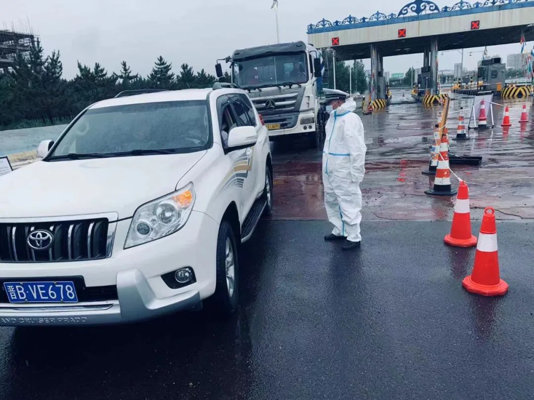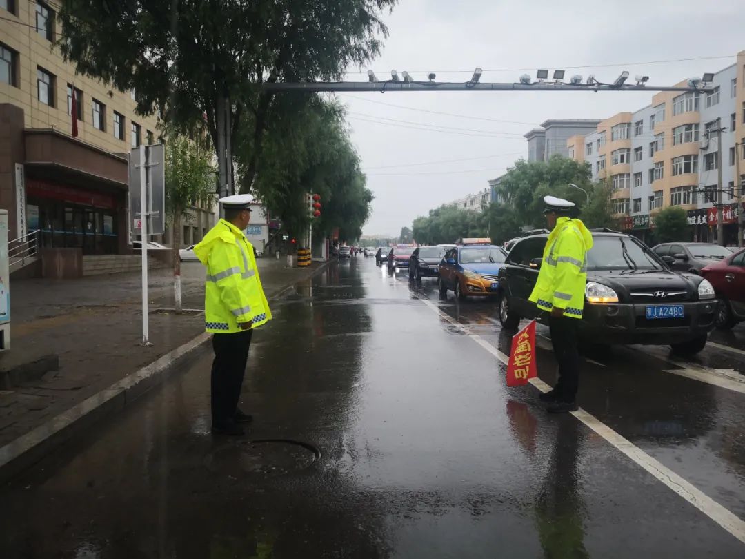 察右前旗交管大队交警冒着大雨,在高速口进行疫情防控执勤,检查来往车辆,守护小城平安。