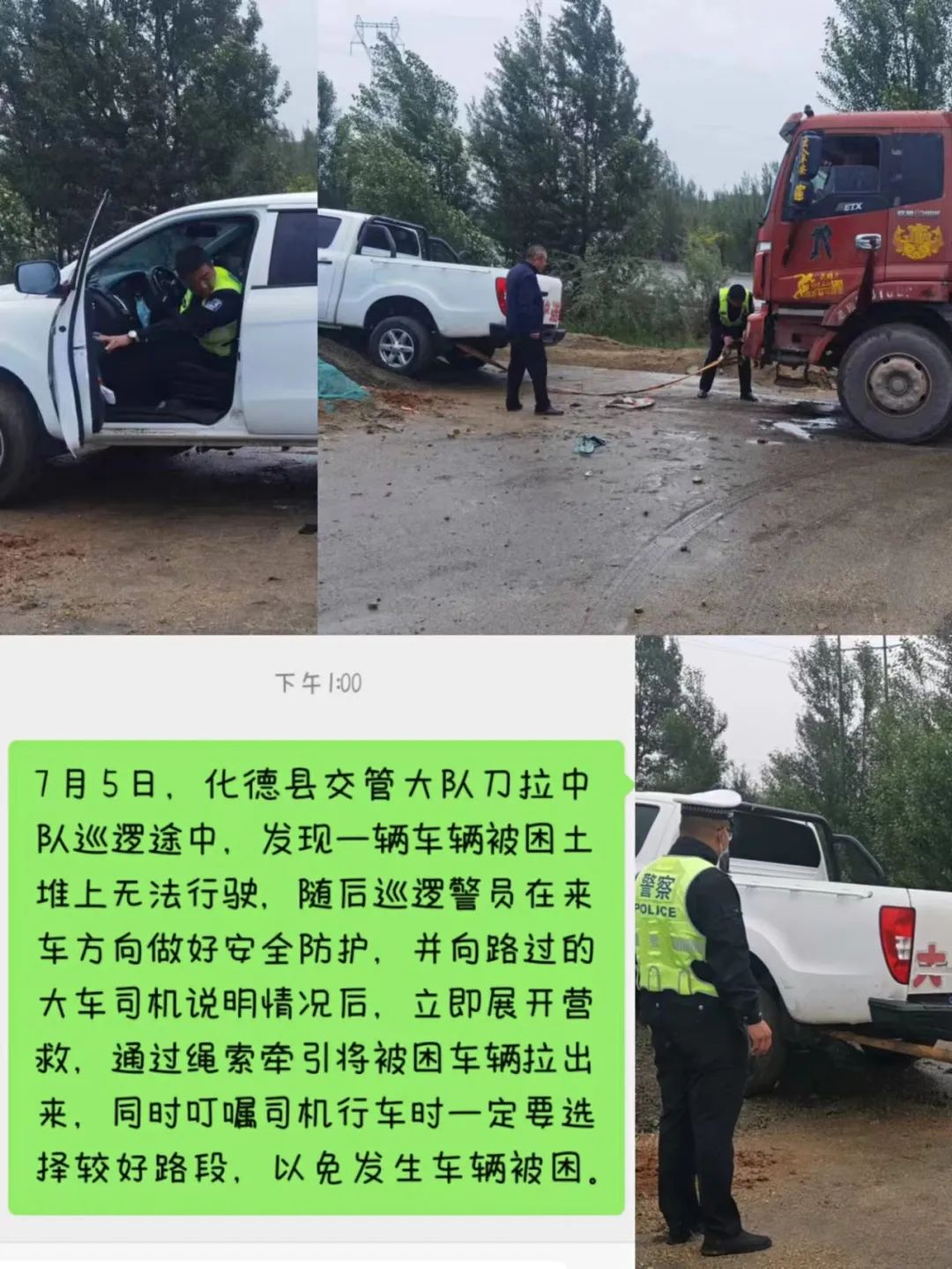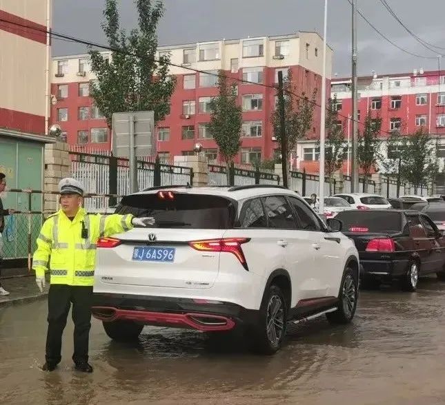 救援之后,大榆树派出所民警顶着大雨,站在河道旁,对后续尝试通过河道的车辆进行劝返,直到水势较小,安全隐患消除之后才放心离开。