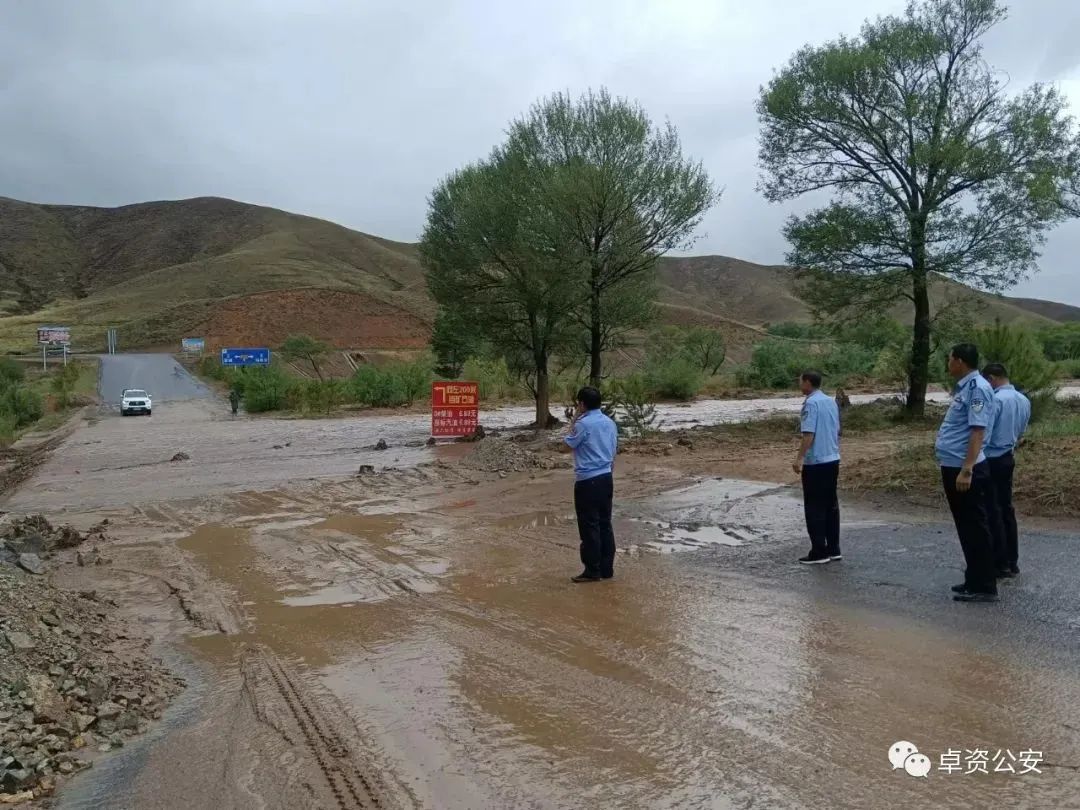 近日,卓资县公安局大榆树乡派出所安排部分民警前往辖区内重点单位进行防洪、防汛检查,部分民警前往王家坡村抗洪救灾。当民警行至羊圈湾行政村阳坡村时,恰逢降雨量陡增,当地多辆汽车被困河道两侧,民警冒雨前往救援。面对没及小腿的水,民警跳入水中将困在水中的车辆推出河道,并对道路两旁的车辆疏导、劝返。