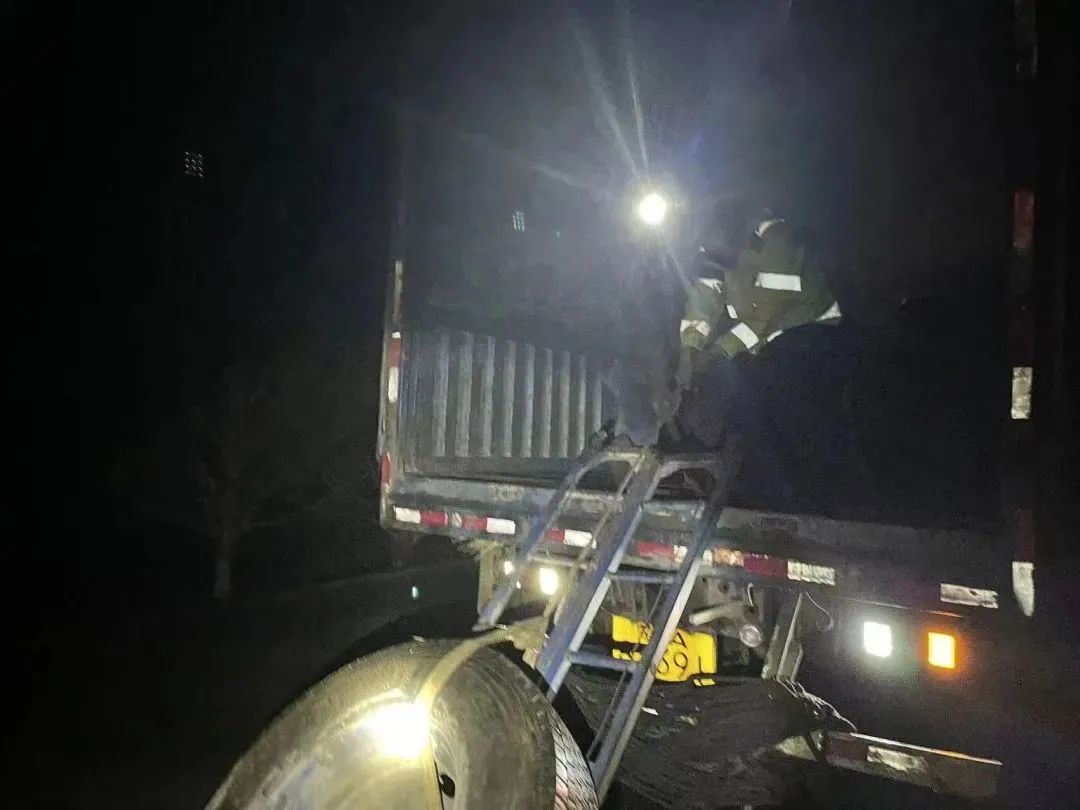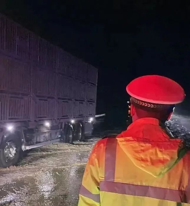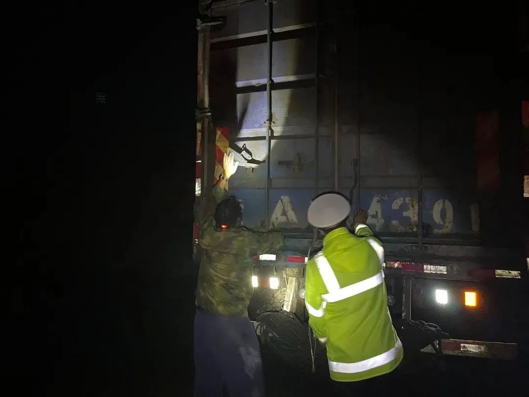 察右后旗交管大队夜间巡逻时发现一辆大货车停在行车道上。阴雨天气,视线不佳,交警迅速下车询问情况。经了解,驾驶人备用车胎掉落,无法独自将车胎放入车中。交警及时疏导交通,帮助驾驶人解决困难,消除安全隐患。