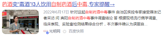 据了解,2010年-2022年6月为止,广西报告自制药酒中毒事件共17起,死亡21人,是广西食物中毒主要致死因素。其中,饮用含有乌头碱的自制药酒9起,误采断肠草根浸泡酒饮用8起。