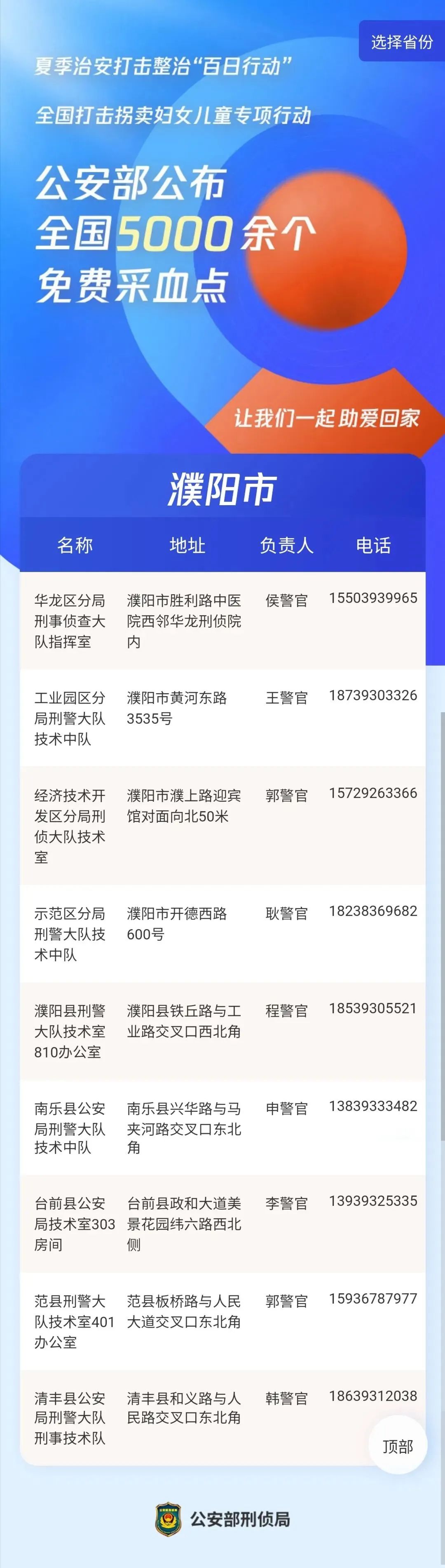 在夏季治安打击整治“百日行动”中,为深入推进打击拐卖妇女儿童犯罪专项行动,充分运用科技力量打拐寻亲,公安部近日公布全国5000余个免费采血点信息,进一步便利广大群众及时就近采血,助力被拐家庭早日实现团圆。