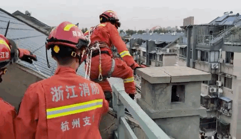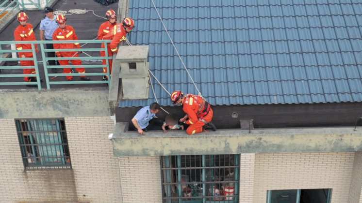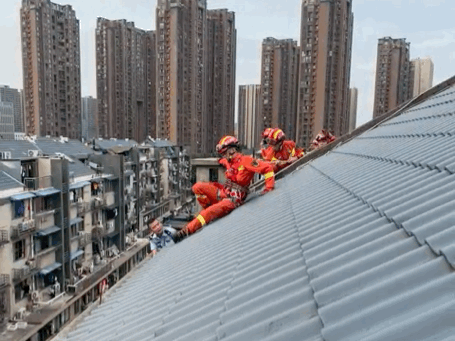 一位消防员紧靠着屋顶斜坡,慢慢滑下去,一只脚踩在边缘稳住后,和熊建明一起把孩子托举起来,接力给在平台上的队友。随后,又一把拉起熊建明,帮他也回到平台。