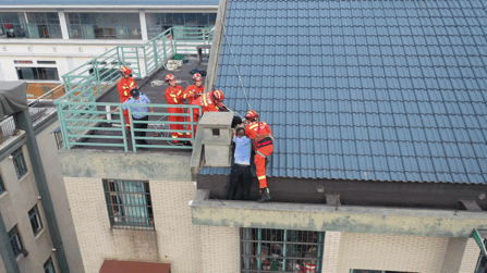 救援方案确定后,指挥员立即下令所有救援人员做好个人安全防护,由班长攀爬屋檐,其余号员在一旁负责保险绳和安全警戒。
