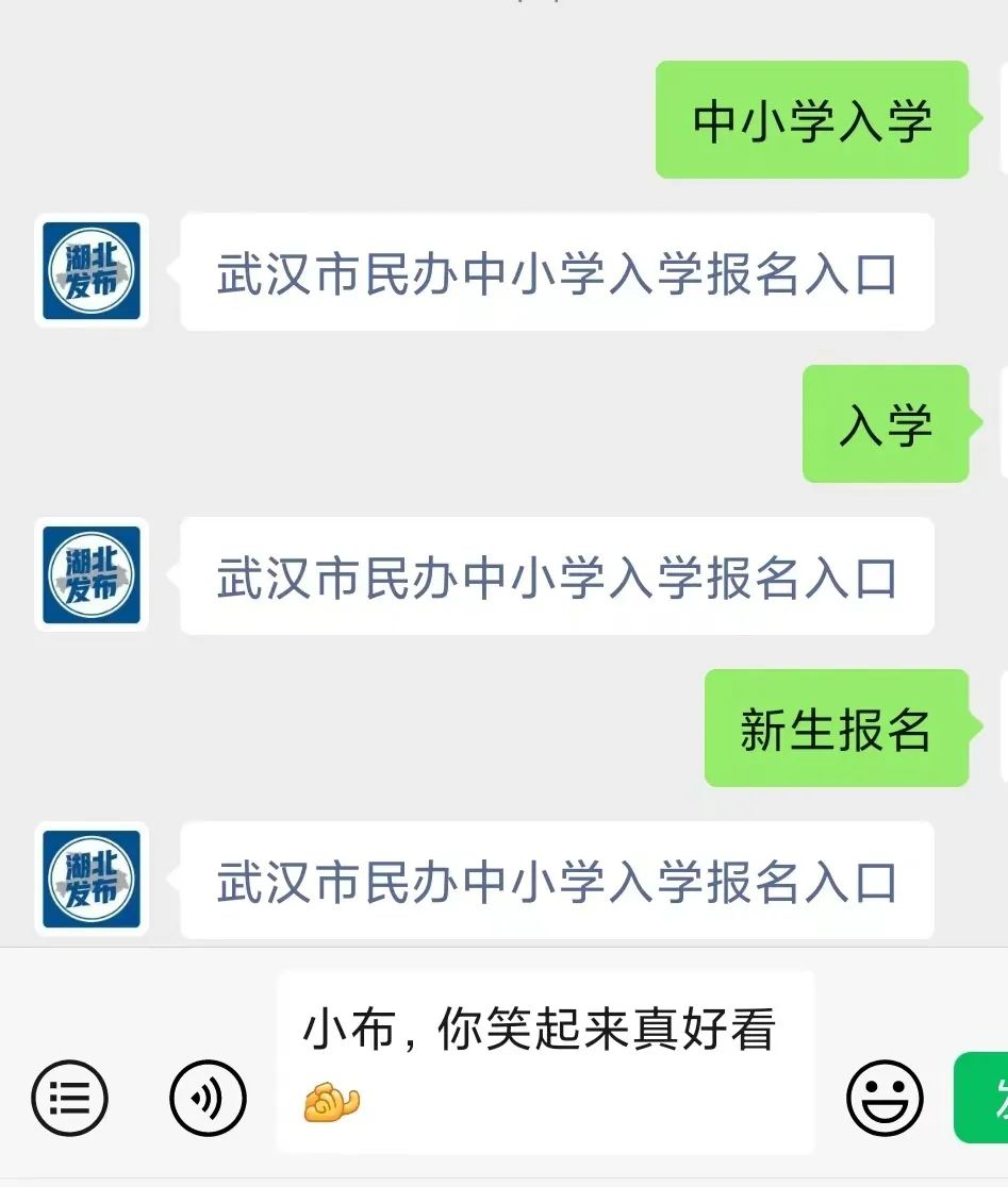 二、在对话框输入“入学”、“中小学入学”、“新生报名”任一关键词,点击回复蓝字,跳转到报名页面,7月日准时开启。