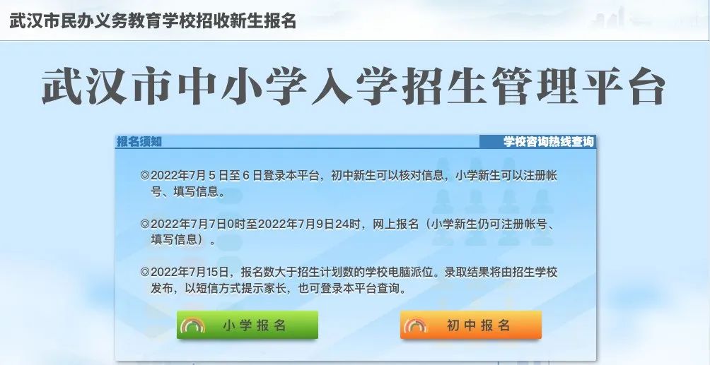 2.7月7日0时至7月9日24时登录本平台,网上报名。此时间段小学新生仍可先注册账号填写信息,再完成网上报名。