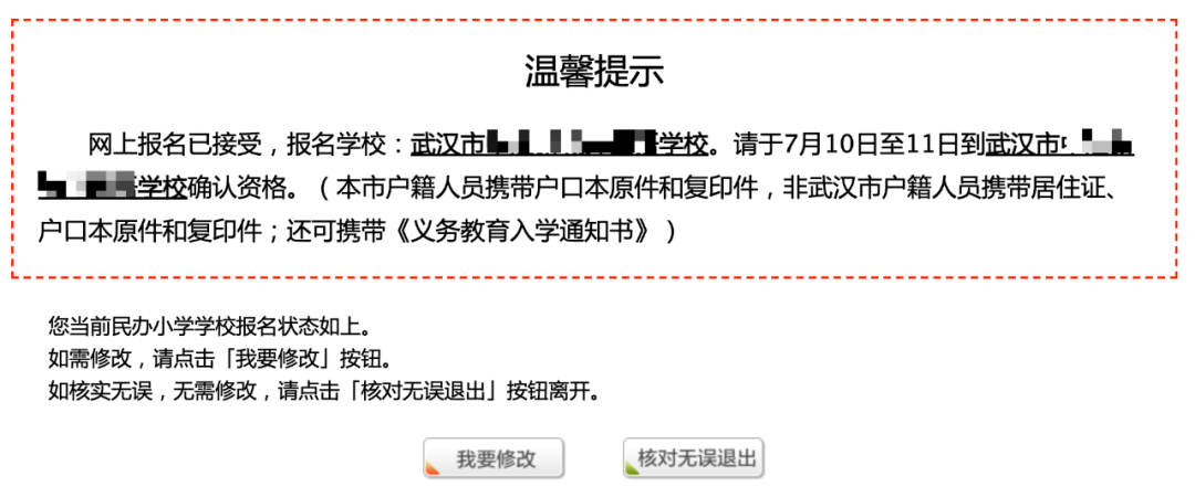 4.在上图报名状态页,再次核对报名状态。如需修改报名学校,点击“我要修改”按钮进行修改;如核对报名状态无误不修改,请点击“核对无误退出”按钮退出本次操作并注销登录。