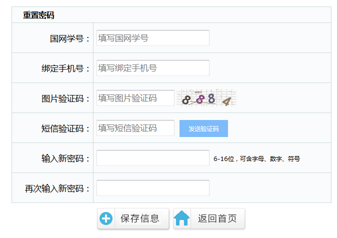 请务必注意学生信息资料的安全保护。登录后请修改密码。如遗忘密码,请点击登录页“重置密码”按钮,进入重置密码页,按平台提示填写各项内容,并输入登记的手机号收到的6位数字短信验证码,两次输入新密码,点击“保存信息”按钮后,可用设置的新密码登录。