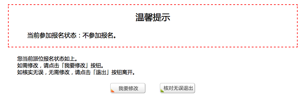 5.在报名状态页,请再次核对报名状态。如需修改报名意愿,点击“我要修改”按钮进行修改;如核对报名状态无误不修改,请点击“核对无误退出”按钮退出本次操作并注销登录。