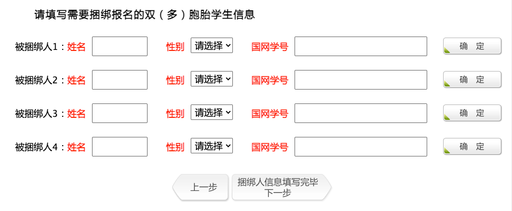 上一步骤勾选“是”,点击“下一步”后,请按系统提示填写需要捆绑报名的双(多)胞胎学生信息,只需要填写被捆绑人的姓名、性别、身份证号(小学)或国网学号(初中),点击“确认”按钮,完成双胞胎捆绑。如果是多胞胎,继续填写下一个被捆绑学生信息,并点击“确认”按钮,直至所有需要捆绑的多胞胎学生都捆绑完成。若信息填写有误,系统将提示无法完成捆绑。