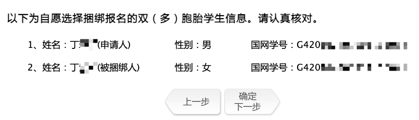 上一步所有需要捆绑的多胞胎学生都捆绑完毕后,点击“捆绑人信息填写完毕。下一步”,系统提示“以下为自愿选择捆绑报名的双(多)胞胎学生信息。请认真核对。”