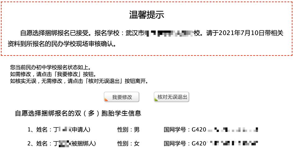 点击“我要修改”按钮,将解除所有多(双)胞胎的捆绑关系,并清除所有捆绑多(双)胞胎的报名意愿。多(双)胞胎学生解除捆绑后可各自进行报名,也可根据上述步骤重新捆绑报名。