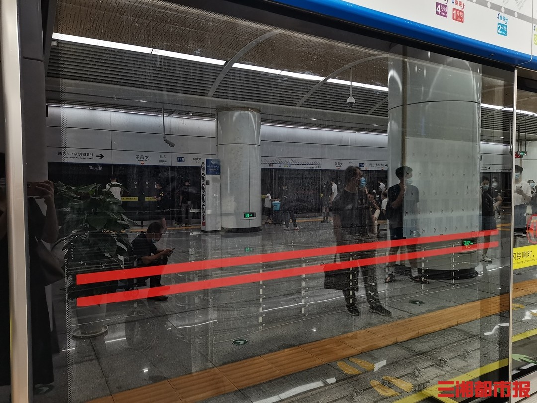7月5日,记者走访了长沙地铁6号线烈士公园南站、湘雅医院站及文昌阁站三个站点。在上述三个站台的站台层的地面均未发现明显积水,屏蔽门内外两侧也都是干燥状态。但是,在文昌阁站,记者发现屏蔽门内部有线状水渍痕迹。