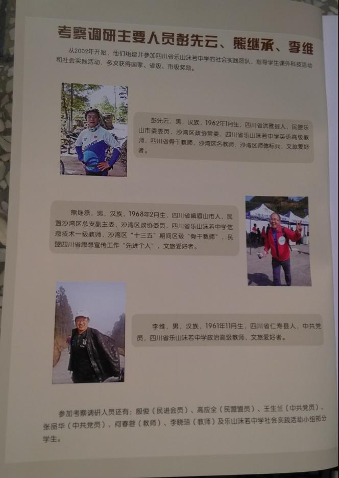 民盟乐山市沙湾区总支自成立以来牢固树立“不忘合作初心 继续携手前进”,坚定“关注民生 奔走国事”,做到“围绕中心 服务大局”的思想,认真履行参政党的职责,涌现出一批批参政议政像彭先云、熊继承一样的优秀盟员。彭先云、熊继承作为多届的沙湾区政协常委,他们拥有强烈的参政议政责任感,尤其是钟情峨眉姊妹山二峨山、三峨山、四峨山旅游资源开发的调研,2002以来,他们利用课余时间和周末,骑上自行车,带上干粮,穿越茂密的原始森林,累了坐在路边休息,饿了吃点干粮,渴了喝点山泉水,行程3万多公里对峨眉姊妹山进行连续二十多年不间断的文旅资源探索和考察,掌握了峨眉姊妹山旅游资源最详实的原始数据,为乐山市委、市政府,沙湾区委、区政府开发姊妹山旅游决策提供了十分有用的参考价值,其中将连结乐汉高速峨眉沙溪乡出口,修建峨沙康养大道,将三座峨眉姊妹山串连成一个整体,融入大峨眉山系文旅整体开发建议被市委市政府采用,也列入了省上交通的“十四五”规划,由于他们表现突出,多次在区政协大会上了发言,多次获得了优秀政协委员的荣誉。他们定情于峨眉姊妹山,脚踏实地,乐此不疲的调研精神,为盟员的参政议政树立了榜样。