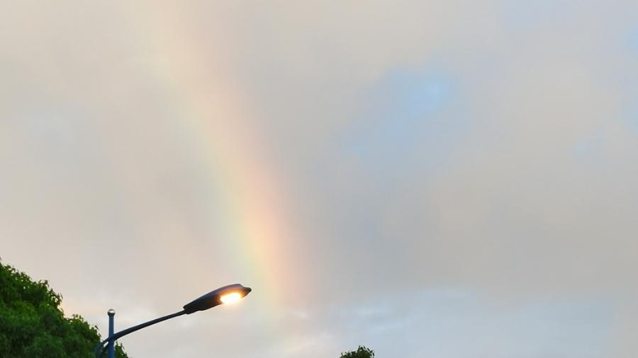 再次与这二位相见,已是不久之前的夏至。我骑着单车穿行在被树木掩映着的学校道路上,无意间,看着华灯初上的街道尽头,有一弯浅浅的彩虹,好似那许久未见的少女,脸上绽着盈盈的微笑,款款向我走来。上一次的相遇,是在无垠的旷野之上,而这一次,她却出现在了高楼大厦之间的一处小小的角落。好似那“春色满园关不住,一枝红杏出墙来”般,乖巧的立着,等待着人们的观赏。我赶忙停下了单车,驻足观赏起这位许久不见的老朋友。但她却像是害羞了般,捂住了嘴,连身影也变得若隐若现,因为立在路中,身旁的行人投来的目光也令我有些脸红。有一刹那,我想学着英伦的绅士脱帽行礼,但是摸着光秃秃的头,我才知道我的举动多么令人啼笑皆非。而彩虹像是看出了我的想法,身影清晰了些,伴随着霓虹灯微微摇曳,像是笑弯了腰。我连忙拍了一张照,为了将这一刻留在心中,驾车匆匆离去了。