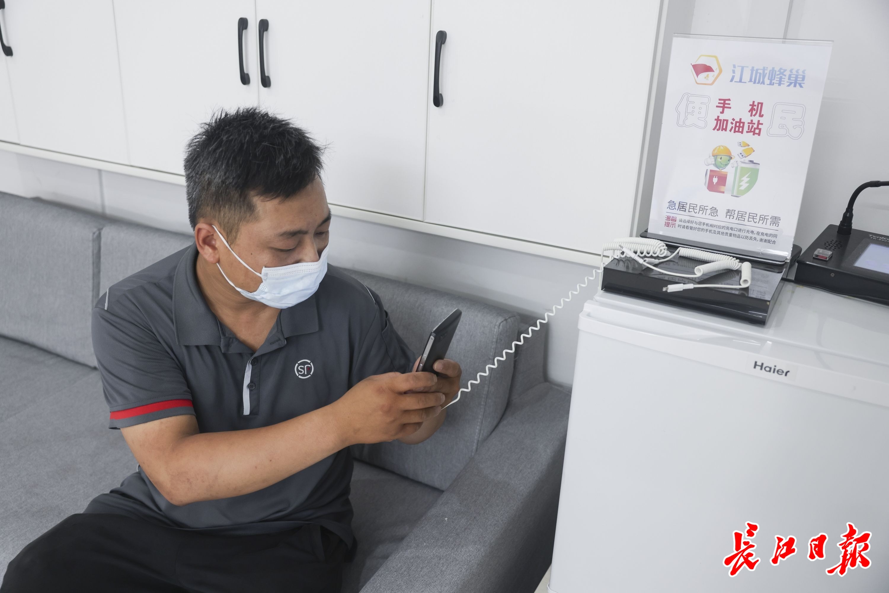 一位快递员在江城蜂巢便民点为手机充电。记者胡冬冬 摄