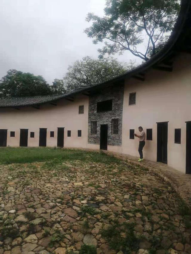 从围龙屋里面走出,我们来到前面的平地上,发现岗埔围龙屋与梅州焦岭基体一样,也是依山而建,呈半月形。