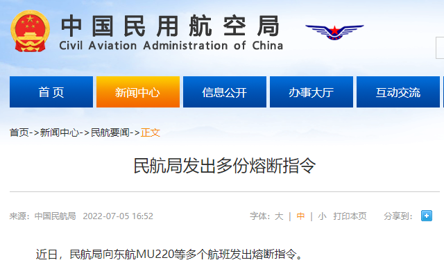 近日,民航局向东航MU220等多个航班发出熔断指令。