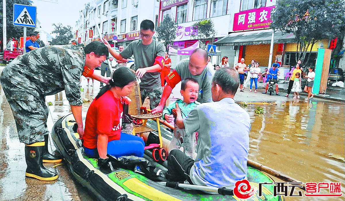 7月4日,平乐县张家镇应急队员用皮划艇护送被困老人和小孩回家。当日凌晨,该镇因承载上游几个乡镇洪水汇集,集镇、村庄、道路、农田、庄稼多处被洪水淹没,部分群众被困,镇党委、政府立即组织应急分队分赴各受灾点,抗洪抢险。唐莉 摄