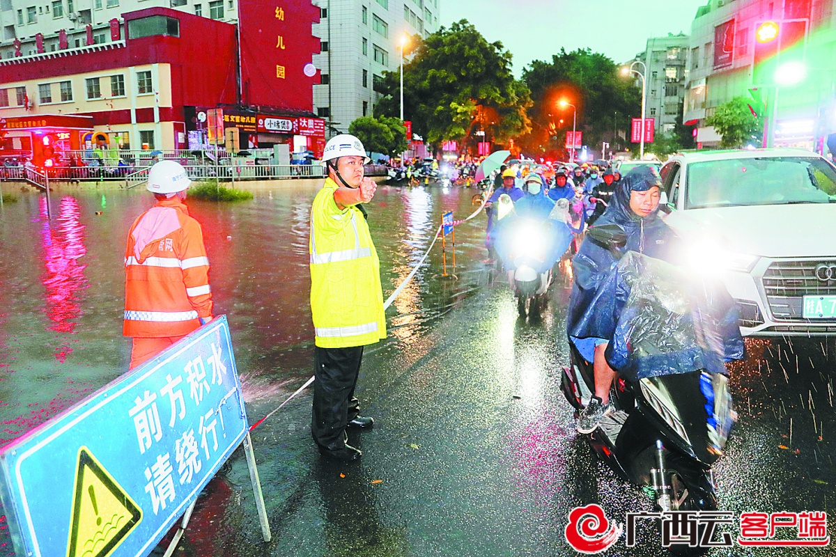 7月5日下午,南宁市区暴雨造成一些低洼路段积水。在建政葛村路口一处易涝点,交警、市政、环卫等部门工作人员对道路采取临时管控和排水作业,确保市民出行安全。广西日报-广西云客户端记者 徐天保 摄