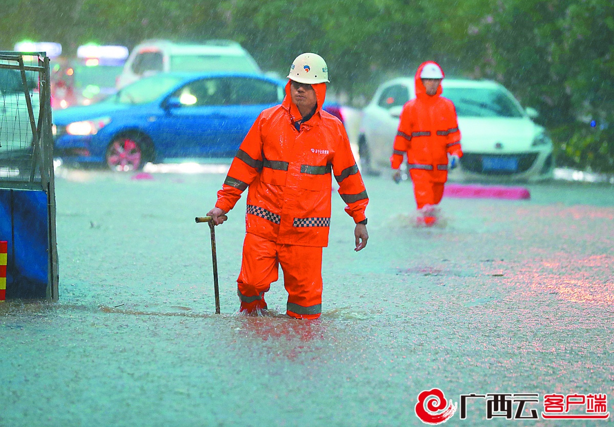 7月5日下午,南宁市区突降暴雨,值守在各易涝点的工作人员立即开展水情监测和排水作业,确保市民安全。图为工作人员在查看水情。广西日报-广西云客户端记者 周军 摄