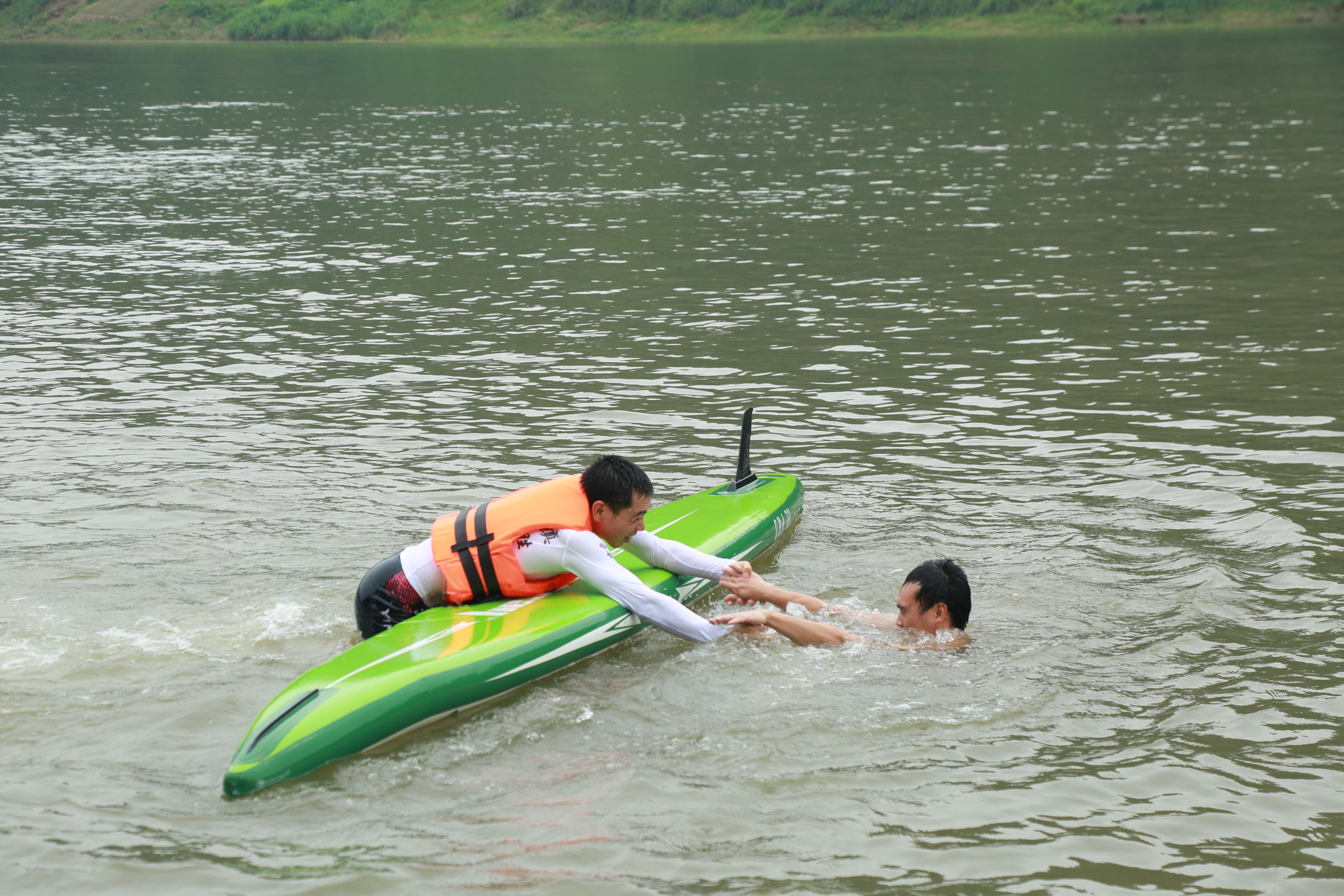2008年,他加入“云溪户外救援队”,利用业余时间刻苦训练,成为救援队的骨干力量。身穿救生衣,脚踏桨板,用力划桨,在湍急的沱江上,对抗着水流的冲击,快速接近救援目标。这是李再忠带领的桨板救援队日常的训练内容。