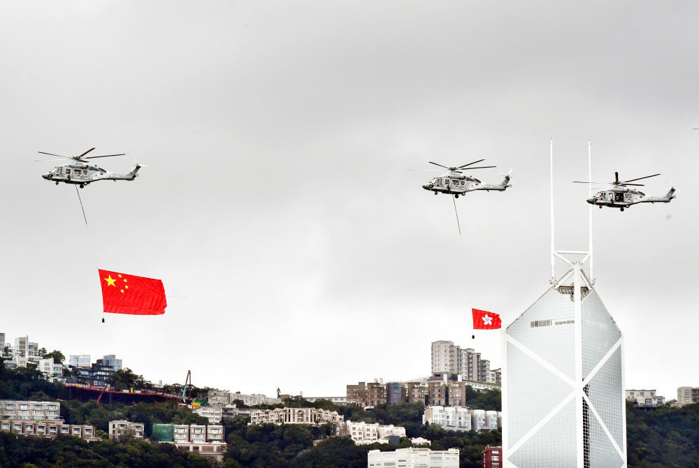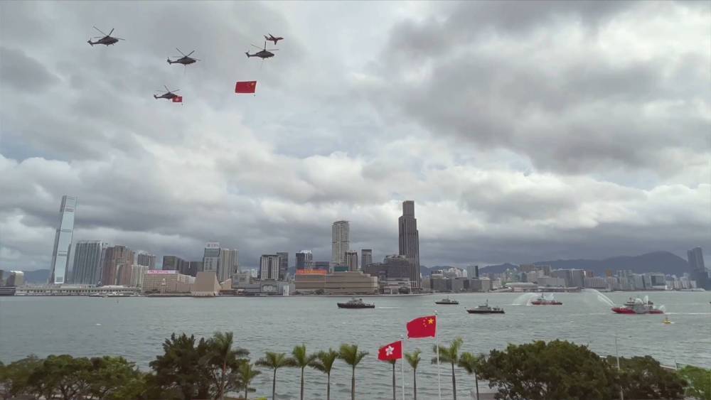 7月1日,香港维多利亚港畔的金紫荆广场上,五星红旗和紫荆花区旗在雄壮的国歌声中冉冉升起。当旗帜升顶之际,悬挂着国旗和区旗的飞行机队以箭形队列造型飞过上空。