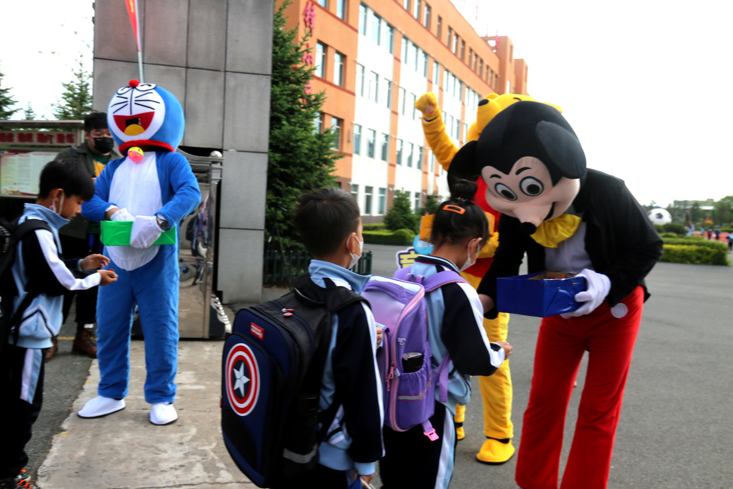 ▲每逢六一儿童节,教师们穿上卡通服装给学生们送上让他们开心的小礼物。