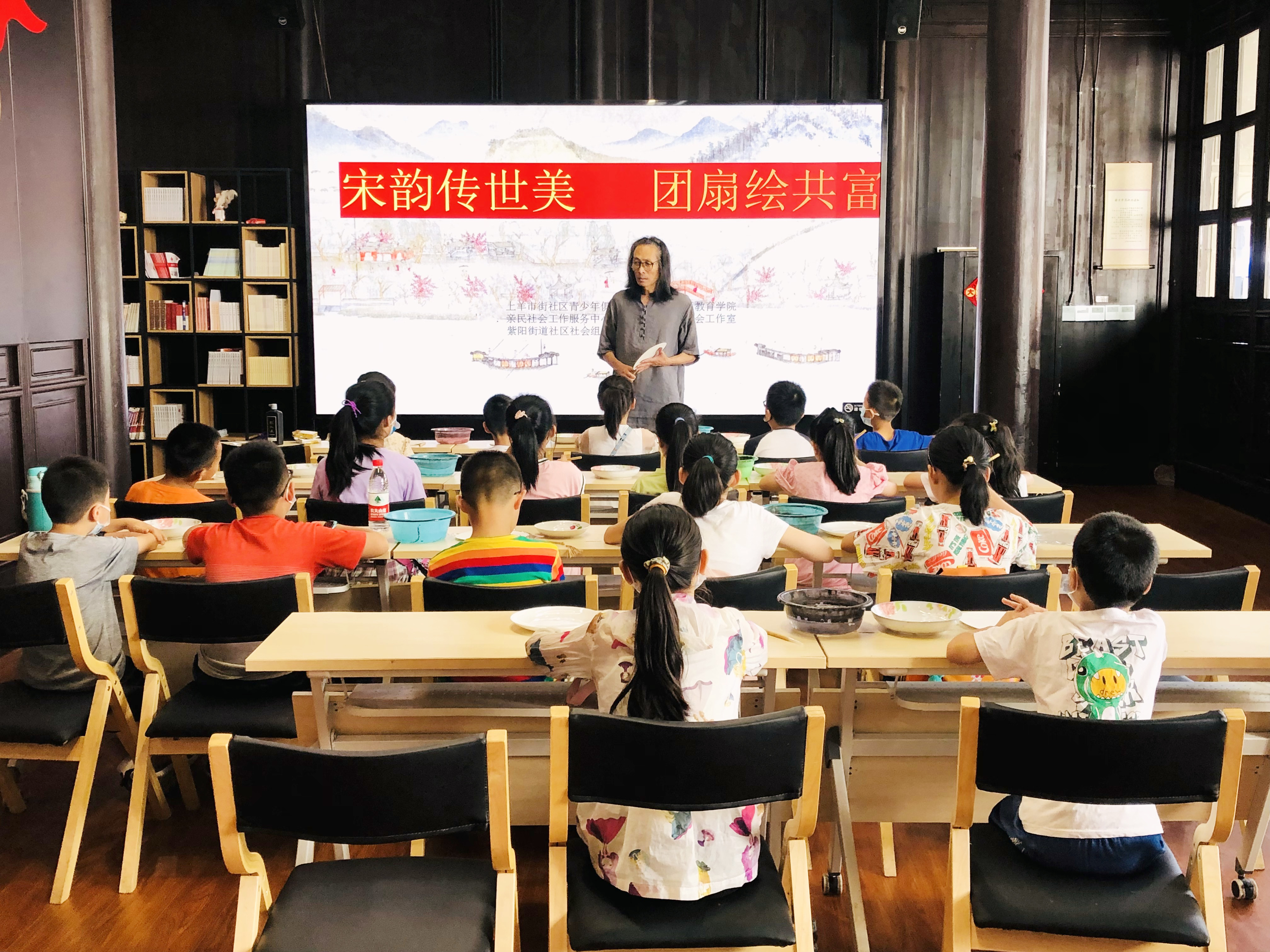 为了弘扬宋韵文化,丰富暑期青少年的精神文化生活,亲民社会工作服务中心联合紫阳街道社会组织服务中心、上羊市街社区社会工作室于2022年7月6日组织开展宋韵传世美团扇绘共富——青少年暑期系列活动,吸引了不少居民带小朋友来参加。