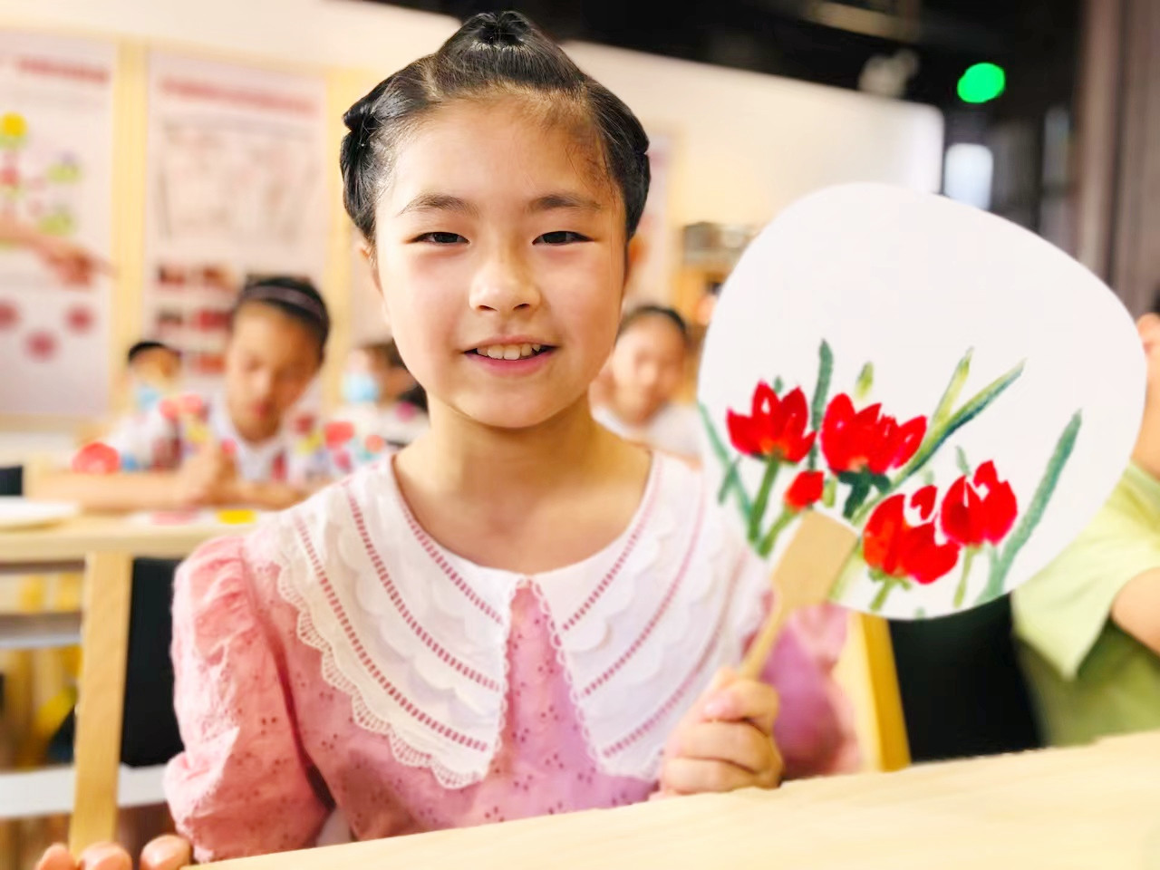 随后在小朋友们对团扇绘画有了大致了解的基础上,老师开始了现场实践教学,根据小朋友的年龄段,一笔一画的教小朋友们画她们比较熟悉的草莓和小鸡,也让小朋友们在绘画的时候可以自由发挥,在不忘传统艺术形式的基础上与时俱进,孩子们不仅学习到了知识,又从中得到了娱乐与放松。