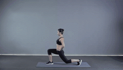 动作要点:自然站立,收腹挺胸,左腿向前迈出成弓步,右腿屈膝慢慢向下,上体正直,两臂扩胸,大腿与躯干垂直,膝盖接触地面后伸直右腿,然后右腿向前迈出,重复相同动作,动作保持约2秒,然后换另一侧。