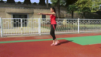 动作要点:挺胸收腹,身体保持放松,跳跃落地时膝关节保持自然微屈。此动作练习8x8拍。