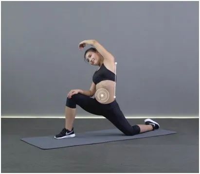 动作要点:挺胸收腹,前侧腿膝盖不要超过脚尖,后侧腿脚尖着地,与前侧腿脚尖方向一致;大腿与地面平行,小腿与地面垂直,充分伸展手臂。持续10-20秒,左右交替练习各2次。