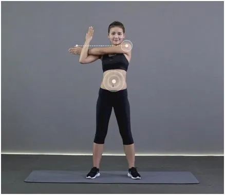 动作要点:挺胸收腹,左臂自然伸直,右臂持续向内缓慢发力。持续10秒,左右交替练习各2-3次。