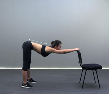手稳扶椅子把手,保持抬头挺胸,身体缓缓下压,直到肩膀、背部有明显的拉伸感觉即可。持续10-20秒后起身,休息调整呼吸10秒后再做下一次,练习3-5次。