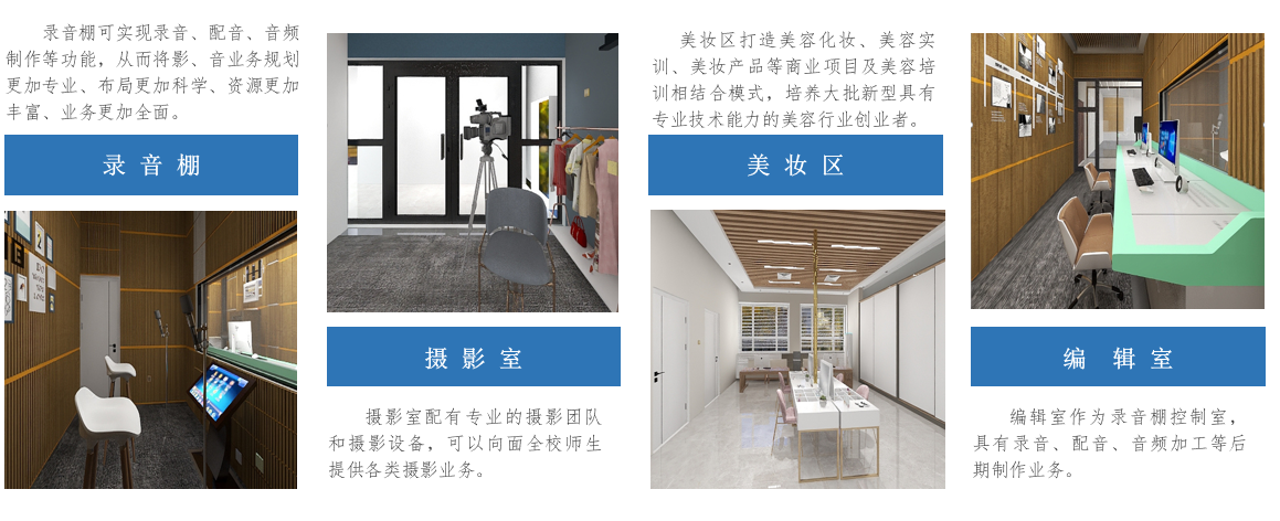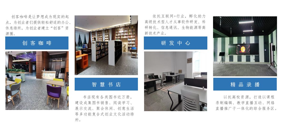 现园区业务内容涵盖影视媒体、电子商务、美妆摄影、软件研发、信息通讯、生物能源、科研文化、美容视光、教育培训、管理咨询、物联网络等11项业务,并建设有完善的生活服务配套设施,设有公用会议室、项目洽谈室、产品展厅、美容化妆区、创客咖啡、智慧书店、培训教室、研发中心、办公室、校园电视台、录音棚、直播间、眼视光室、更衣室等14个功能区,为入孵项目提供资源、社会保障、创业场地、技术顾问、法律顾问、技能培训、招商推广、成果转化、管理咨询、信息查询、政策咨询等服务,并可常年开展人才培训,为多种行业、多类创业主体提供专业的创业指导服务与人才推荐。
