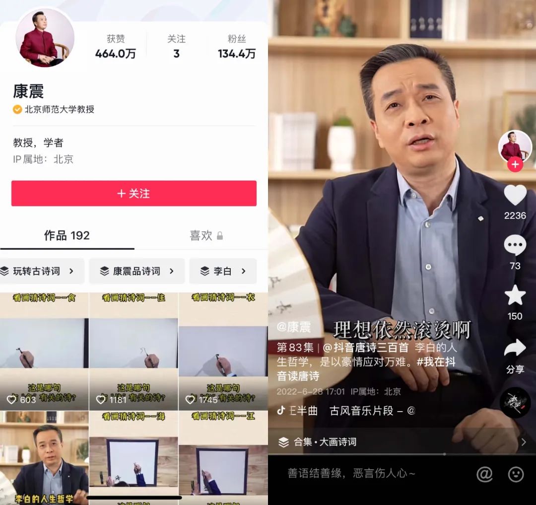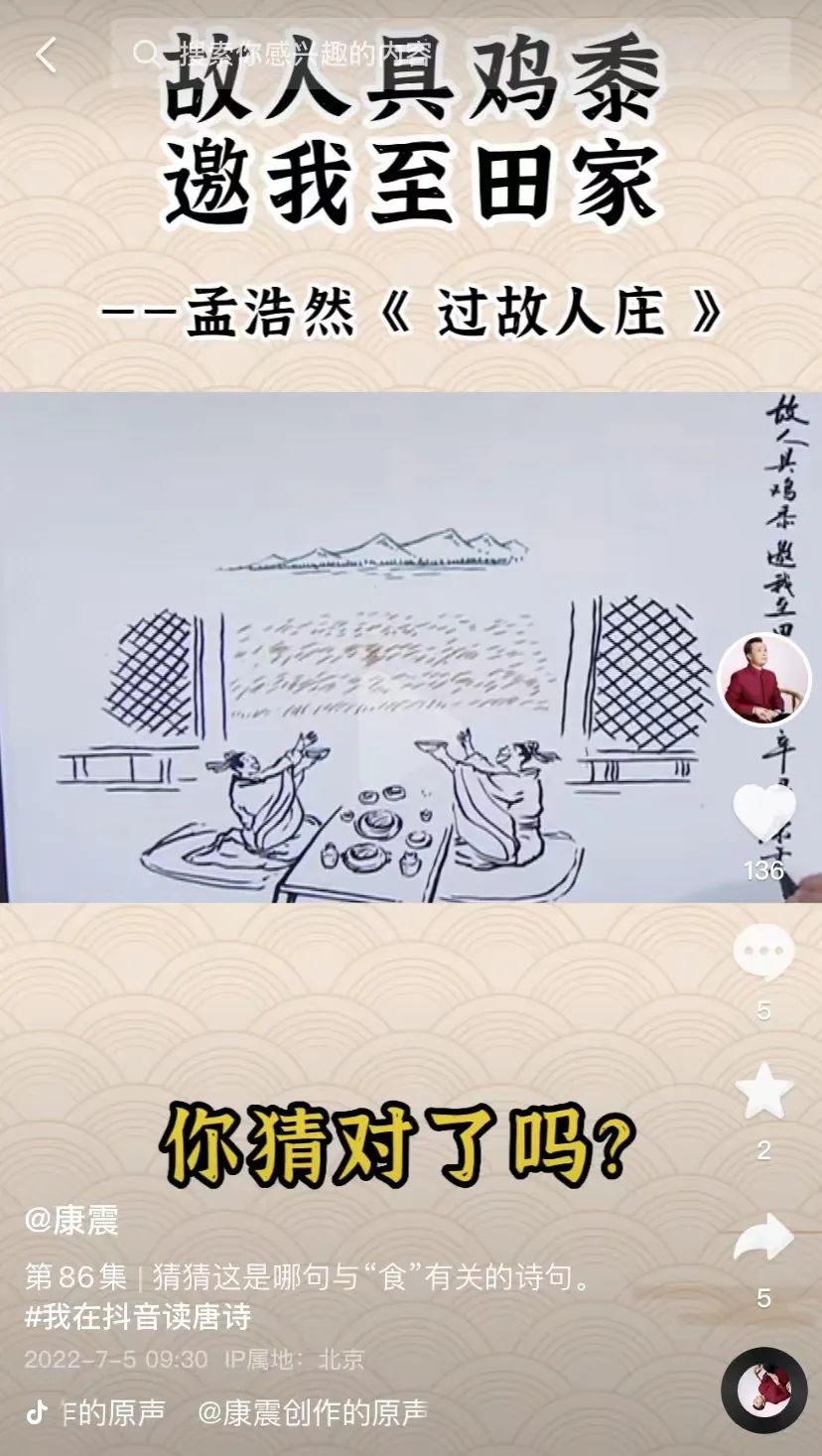 著名诗词研究学者、北京师范大学教授康震也曾在直播中提到,如果古代有抖音,李白、杜甫、孟浩然等会争先恐后开账号,通过抖音让自己的诗词、主张被更多人知道。